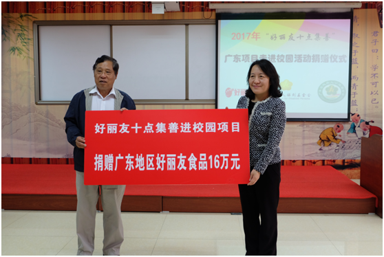 2017年11月13日上午,中国残疾人福利基金会、广东省残疾人公益基金会、好丽友(中国)食品有限公司在广州岑村小学举行了广东省“好丽友?十点集善” 走进校园公益项目捐赠仪式。此次捐赠,为广东地区学校捐赠了价值16万元的好丽友食品,为特教、贫困学校的同学提供上午“十点爱心加餐”,培养学生们丰富饮食结构习惯,从而提高学生们的营养均衡水平。