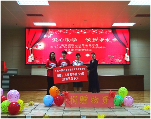 2019年3月28日下午,在佛山市听觉语言康复中心举行“爱心助学,筑梦未来”捐赠仪式。亨氏(中国)投资有限公司工会委员会对广东省残疾人公益基金会再次捐赠,本次捐赠700箱儿童营养品,价值五万多元,全部资助给佛山市听觉语言康复中心的孩子们。